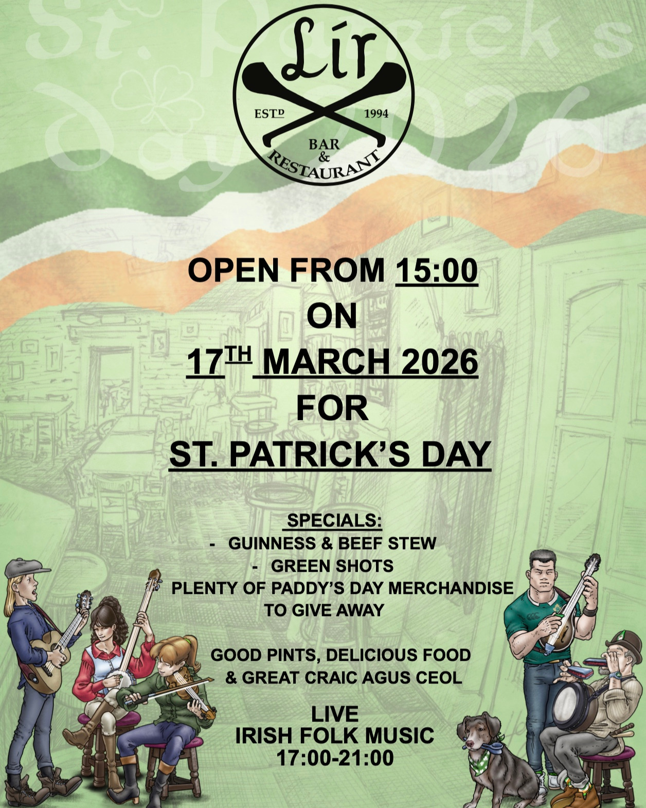 The Lir near Bellevue castle will be serving genuine Irish Stew for Paddy’s day. Additionally, live Irish folk music will be played from 5pm on. Keep an eye on the complimentary merch!