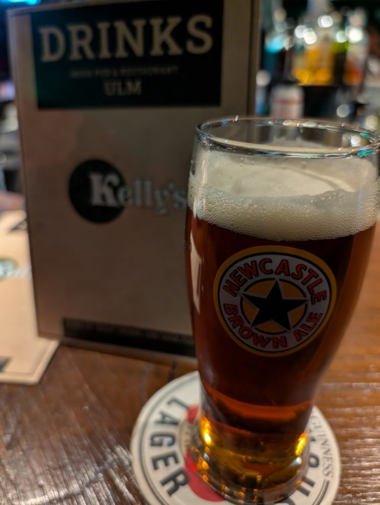 Frisch gezapft vom Fass gibt es im Ulmer Kelly’s die Klassiker Guinness und Kilkenny, außerdem Hop House 13 Lager. Zu Nicos Freude wird auch Newcastle Brown Ale angeboten, was die zweite Bierrunde des Abends wurde. Auch am Zapfhahn: Bayerisches Obendorfer Helles. Alle diese Biere kommen auf Wunsch auch im 1,5 Liter Pitcher. Aus der Flasche bzw. der Dose gibt es noch Allgäuer Büble, Jever Fun sowie das alkoholfreie Guinness 0,0. Das Pint Guiness kostet hier vor Ort 6,80€.